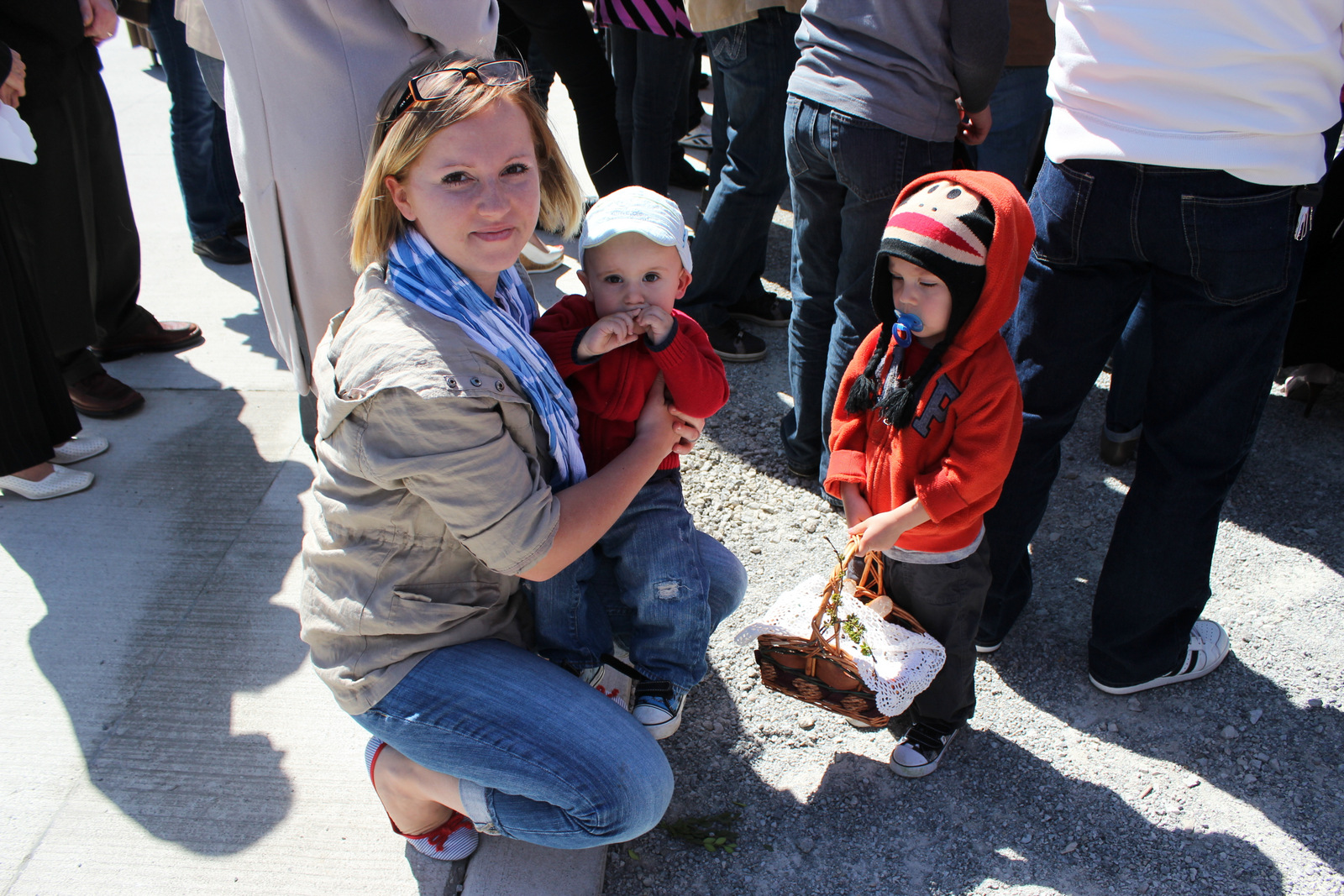 People crowded around outside at a table set up specially to bless our Easter baskets